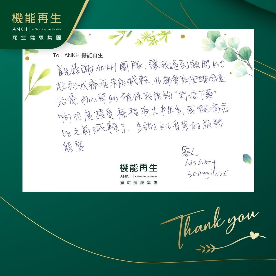 首先感謝ANKH團隊,讓我遇到健康顧問,起初我痛症未能減輕,佢都會為我安排合適理療,用心幫助確保我能夠「對症下藥」,喺呢度接受療程有大半年多,我嘅痛症比之前減輕了,多謝健康顧問專業的服務態度。