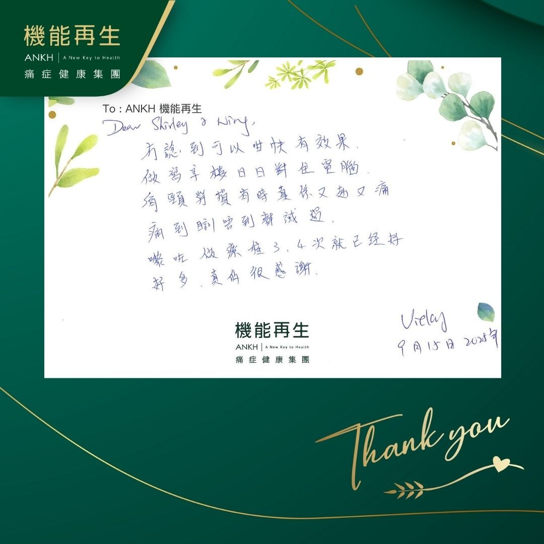 Dear 健康顧問、理療師, 冇諗到可以咁快有效果,做寫字樓日日對住電腦,肩頸勞損有時真係又攰又痛,痛到瞓唔到都試過,嚟咗做療程3、4次就已經好好多,真的很感謝。