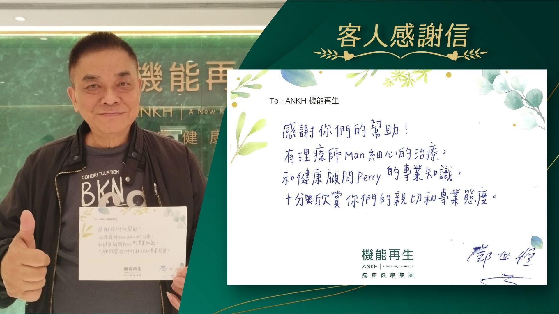 謝謝你們的幫助! 有理療師細心的理療,和健康顧問的專業知識,十分欣賞你們的親切和專業態度。