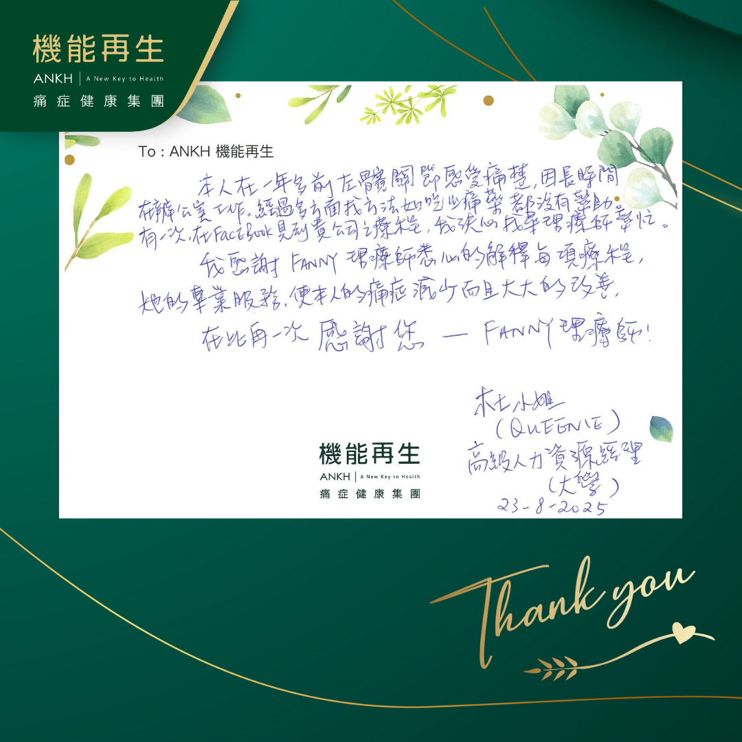 本人在一年多前左髖關節感受痛楚,因長時間在辦公室工作。經過多方面找方法如吃止痛藥都沒有幫助,有一次在Facebook見到貴公司之療程,我決心找尋理療師幫忙。 我感謝理療師悉心的解釋每項療程,她的專業服務,使本人的痛症減少而且大大的改善。 在此再一次感謝您—我的理療師。