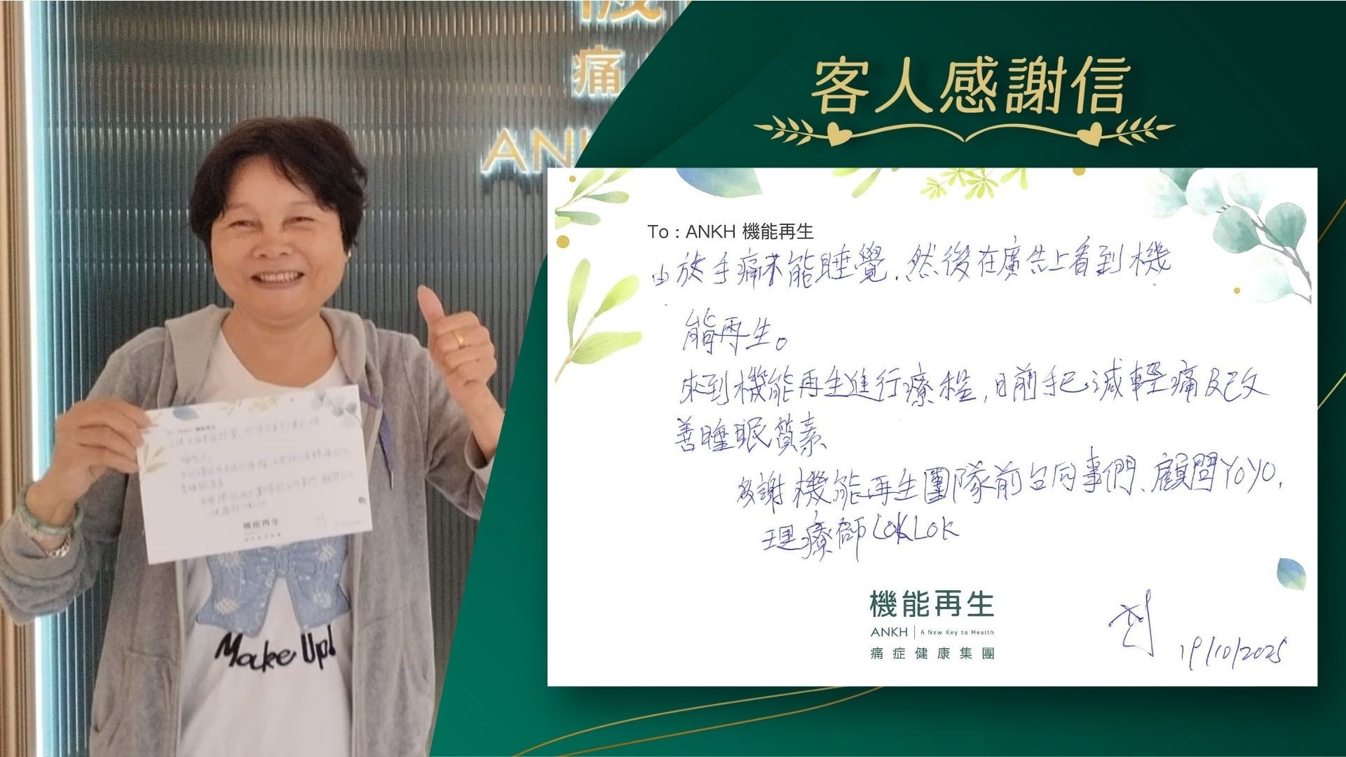 由於手痛不能睡覺,然後在廣告上看到機能再生。來到機能再生進行療程,目前手已減輕痛及改善睡眠質素。多謝機能再生團隊前台同事們、健康顧問、理療師。