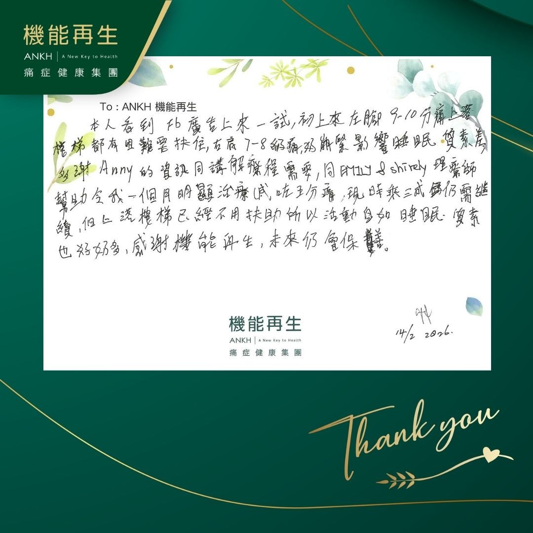 本人看到Facebook上來一試,初上來左腳,9至10分痛上落樓梯,都有困難要扶住,右肩7至8級痛,好繃緊影響睡眠,質素差。 多謝健康顧問的資訊同講解療程需要,理療師幫助我減咗五分痛,現時三成,仍需繼續,但上落樓梯已經不用扶助所以活動自如,睡眠、質素也好好多,感謝機能再生,未來仍會保養。
