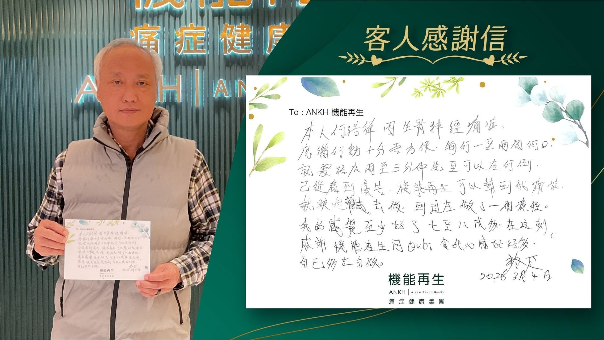 本人因坐骨痛,行動十分唔方便,每行一至兩個街口,就要踎低兩至三分鐘先至可以再行到。 看到ANKH機能再生可以幫到我痛症,就決定去做。到現在做了療程,我的感覺至少好了七至八成多。在這刻,感謝機能再生同理療師,令我心情好好多。