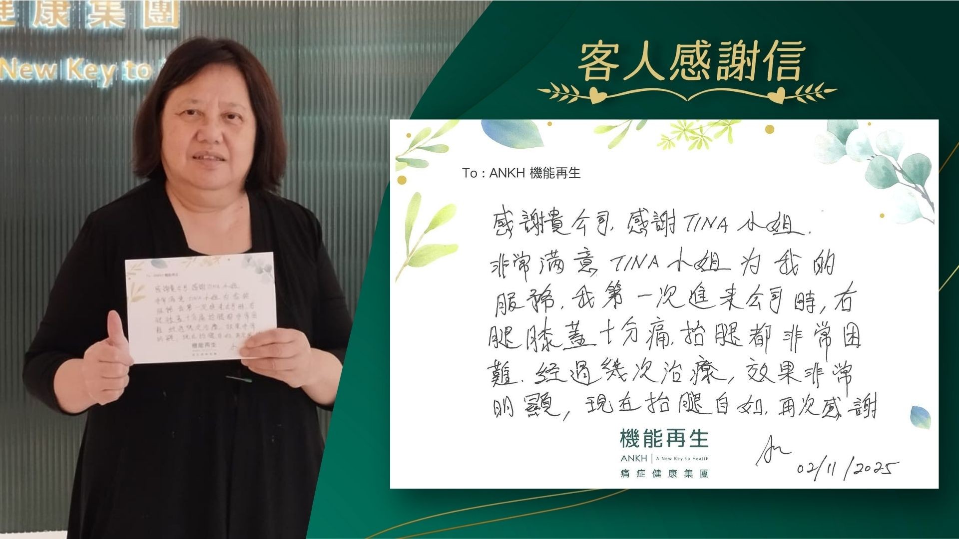 感謝貴公司,感謝理療師,非常滿意她為我的服務,我第一次進來公司時,右腿膝蓋十分痛,抬腿都非常困難,經過幾次理療,效果非常明顯,現在抬腿自如,再次感謝!