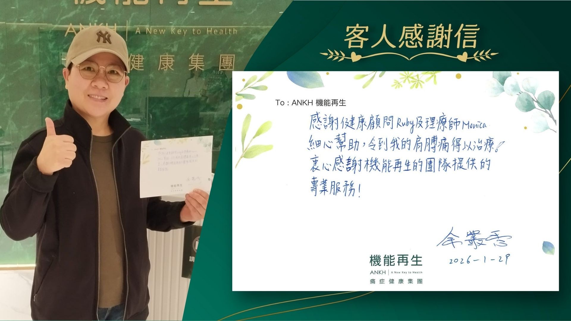感謝健康顧問及理療師細心幫助,令到我的肩膊痛得以理療!衷心感謝機能再生的團隊提供的專業服務!