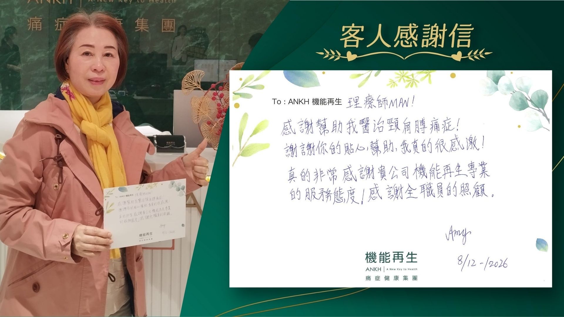 理療師: 感謝幫助我處理頸肩膊痛症!謝謝你的貼心幫助,我真的很感激!真的非常感謝 貴公司機能再生專業的服務態度!感謝全職員的照顧。