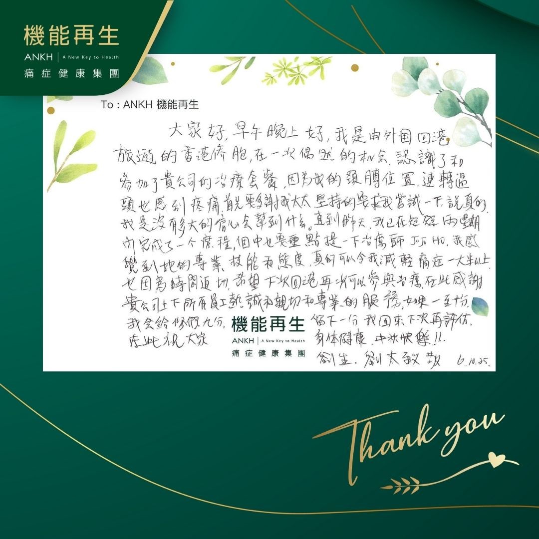 大家好,早午晚上好,我是由外國回港旅遊的香港僑胞,在一次偶然的機會,認識了和參加了貴公司的理療套餐,因為我的頸膊位置,連轉過頭也感到疼痛。首先要多謝我太太,堅持的要求我嘗試一下,說真的我是沒有多大的信心會幫到什麼。直到昨天,我已在短短兩星期內完成了一個療程,當中也要重點提一下理療師,我感覺到她的專業、技能和態度,真的可以令我減輕痛症一大半以上,也因為時間迫切,希望下次回港再次可以參與理療,在此感謝貴公司上下所有員工熱誠和親切和專業的服務,如果一至十分,我會給他們九分,留下一分,我回來下次再評估,在此祝大家身體健康、中秋快樂!