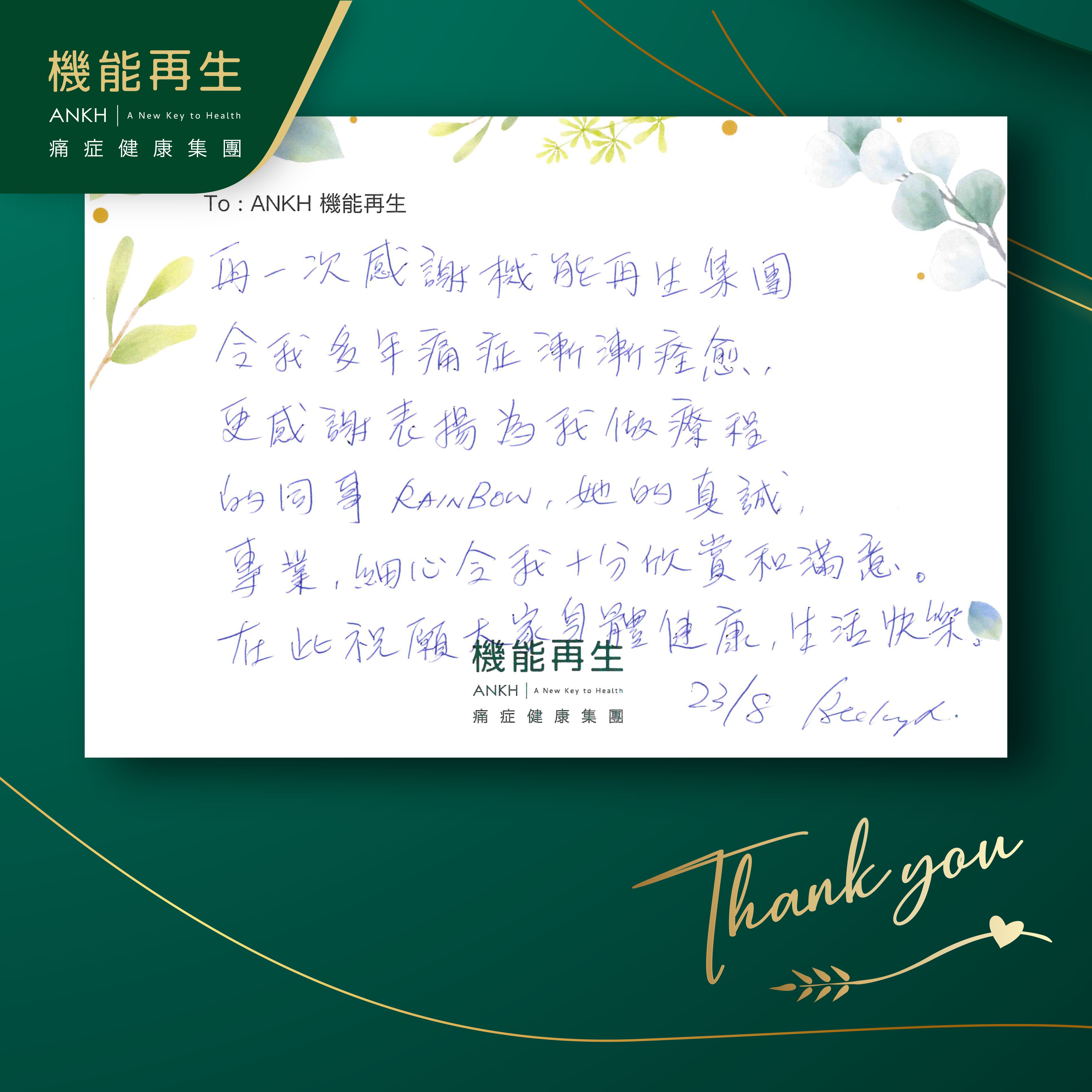 再一次感謝機能再生集團,令我多年痛症漸漸得到解決,更感謝表揚為我做療程的同事,她的真誠、專業、細心令我十分欣賞和滿意。在此祝願大家身體健康、生活快樂!
