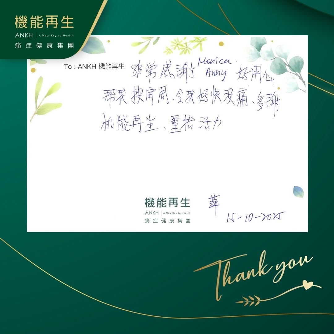非常感謝健康顧問、理療師好用心,幫我按肩周,令我好快沒痛,多謝機能再生,重拾活力。