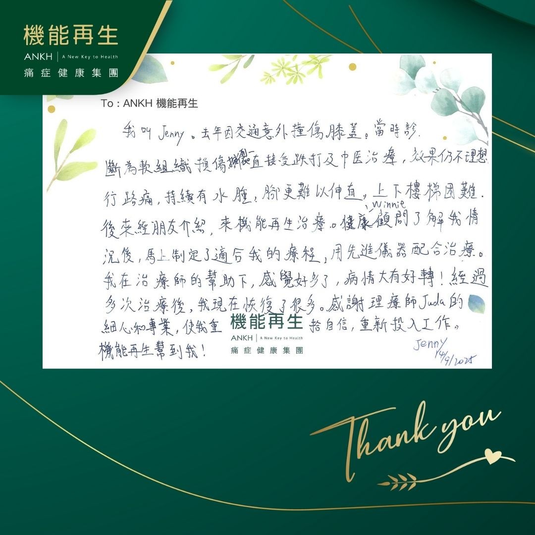 我叫Jenny。去年因交通意外撞傷膝蓋。當時診斷為軟組織損傷撕裂,一直接受跌打及中醫理療,效果仍不理想。行路痛,持續有水腫,腳更難以伸直,上下樓梯困難。 後來經朋友介紹,來機能再生理療。健康顧問了解我情況後,馬上制定了適合我的療程,用先進儀器配合理療。 我在理療師的幫助下,感覺好多了,病情大有好轉!經過多次理療後,我現在恢復了很多。感謝理療師的細心和專業,使我重拾自信,重新投入工作,機能再生幫到我!