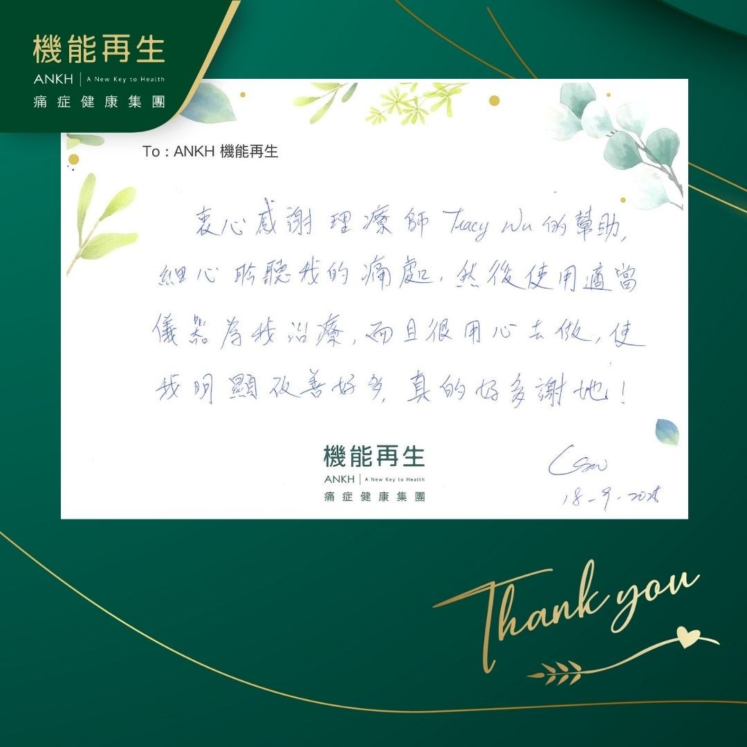 衷心感謝理療師的幫助,細心聆聽我的痛處,然後使用適當儀器為我理療,而且很用心去做,使我明顯改善好多,真的好多謝她!