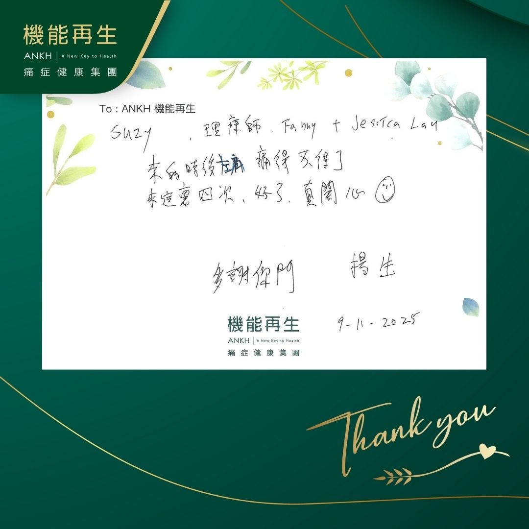 健康顧問、理療師, 來的時候左肩痛得不得了,來這裡之後好了,真開心。多謝你們!