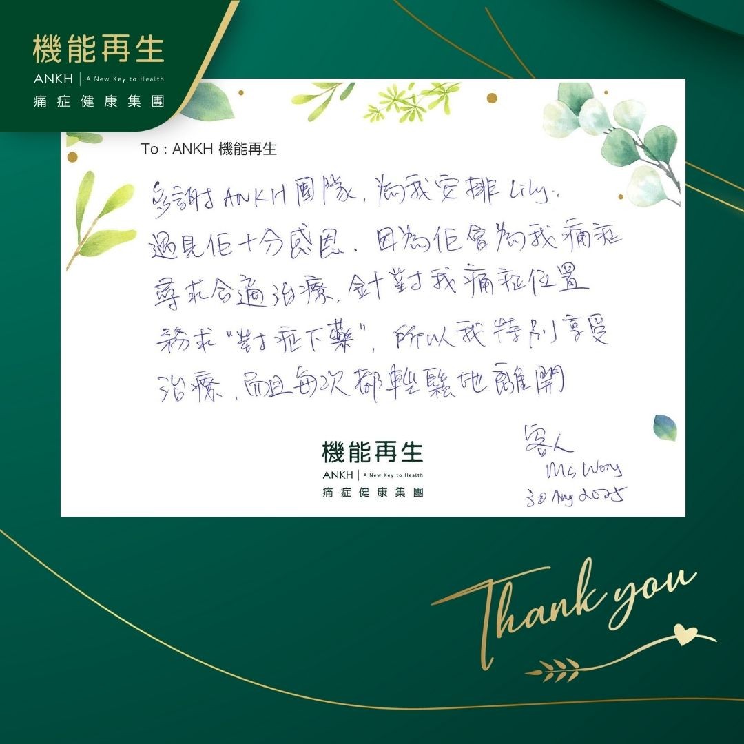 多謝ANKH團隊,為我安排理療師,遇見佢十分感恩,因為佢會為我痛症尋求合適理療,針對我痛症位置務求「對症下藥」,所以我特別享受理療,而且每次都輕鬆地離開。