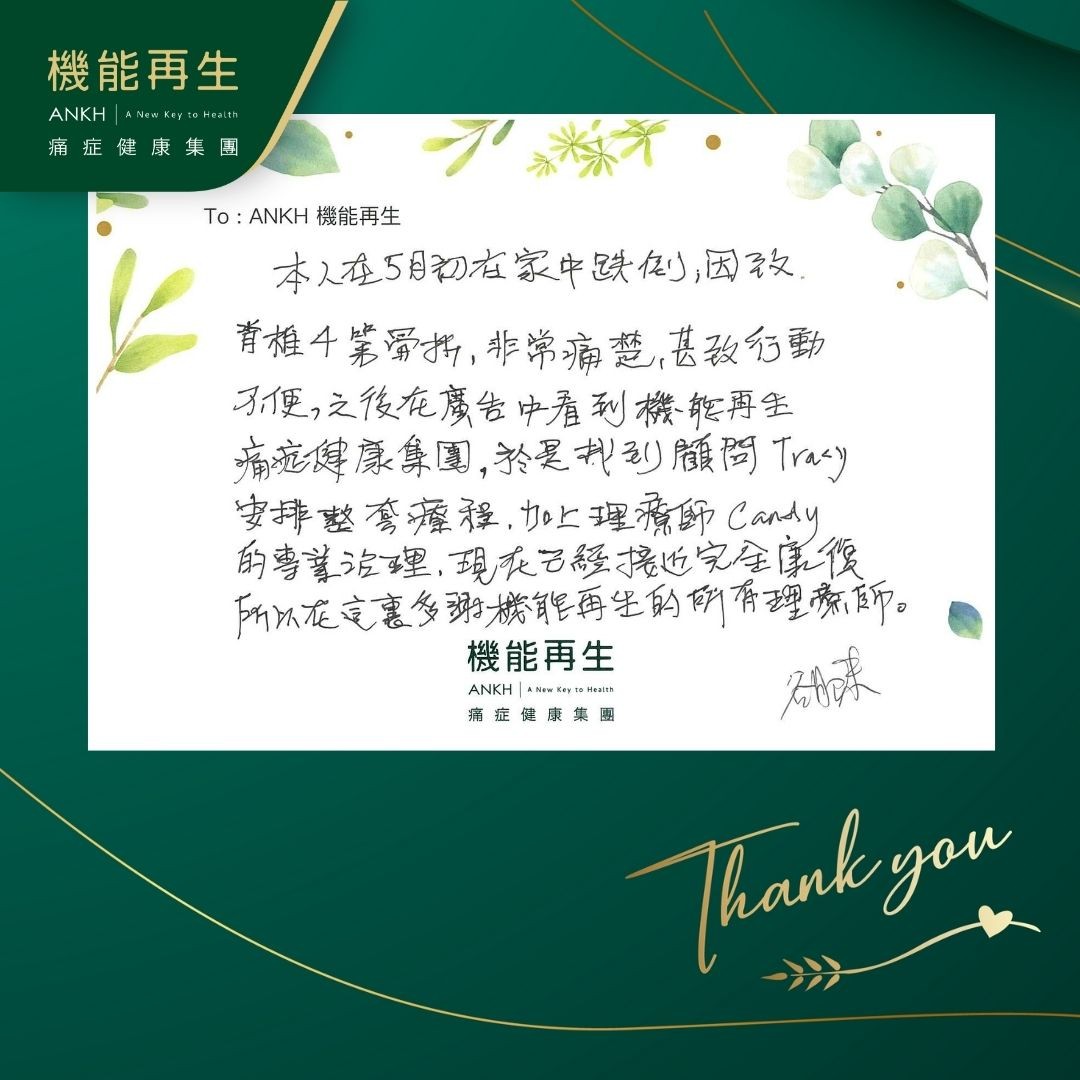本人5月初在家中跌倒,因致脊椎骨折,非常痛楚,甚致行動不便,之後在廣告中看到機能再痛症健康集團,於是找到健康顧問安排整套療程,加上理療師的專業理療,現在已經接近完全康復,所以在這裡多謝機能再生的所有理療師。