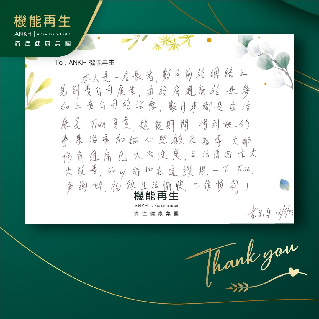 數月前於網絡上見到貴公司廣告,由於肩周痛於是參加上貴公司的理療,數月來都是由理療師負責。這段期間,得到她的專業理療和細心照顧及指導,大部分肩周痛已大有進展,生活情況亦大大改善,所以特此在這讚一下她。多謝妳,祝您生活愉快、工作順利!