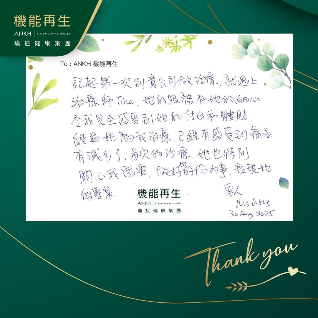 記得第一次到貴公司做理療,就遇上理療師,她的服務和細心令我完全感受到她的付出和體貼,經過她為我理療,已經有感受到痛症有減少了,每次的理療,她也特別關心我的需要,做好她的份內事,表現她的專業。