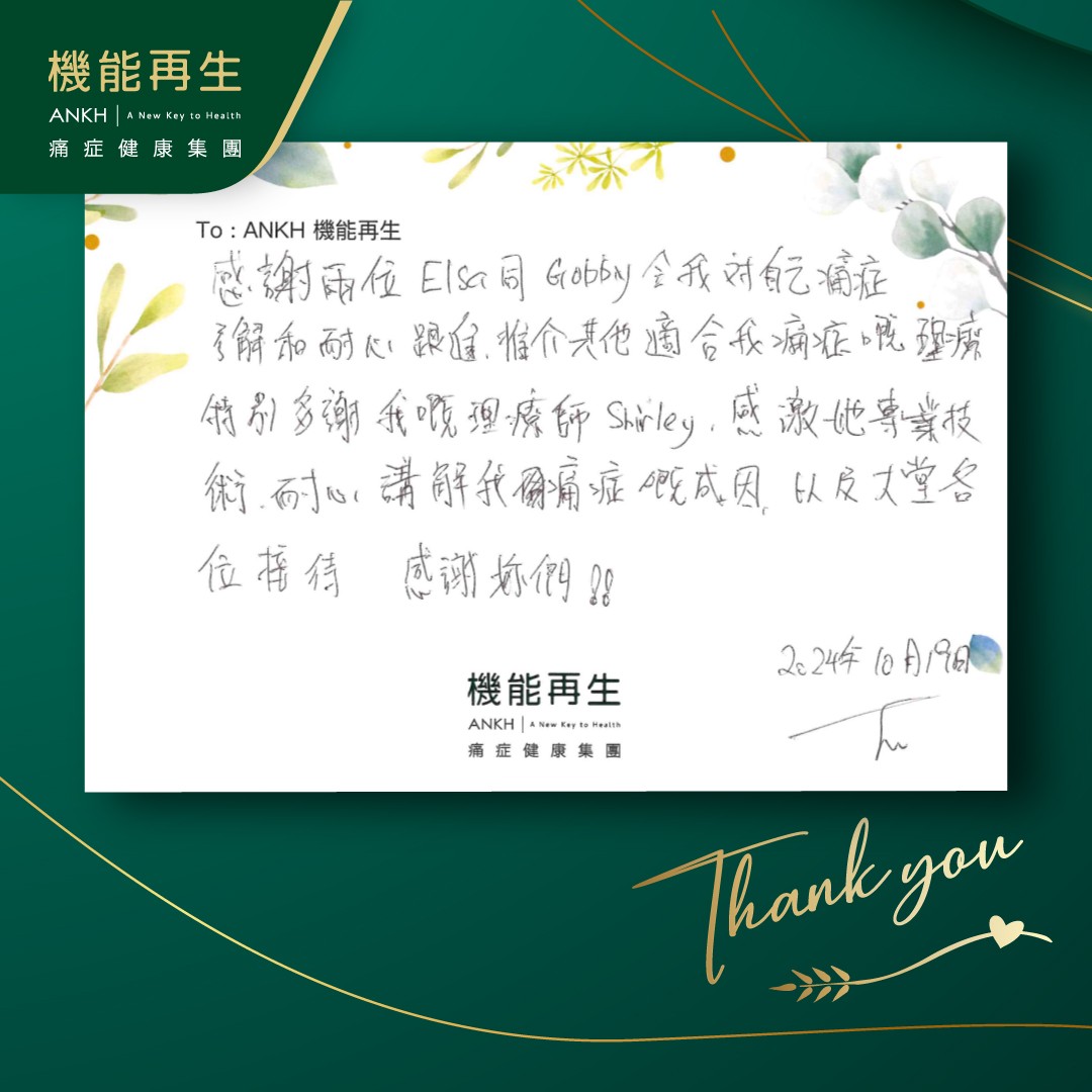 感謝兩位健康顧問令我對自己嘅痛症了解和耐心跟進,推介其他適合我痛症嘅理療,特別多謝我嘅理療師,感激她專業技術、耐心,講解我痛症嘅成因,以及大堂各位接待,感謝妳們。