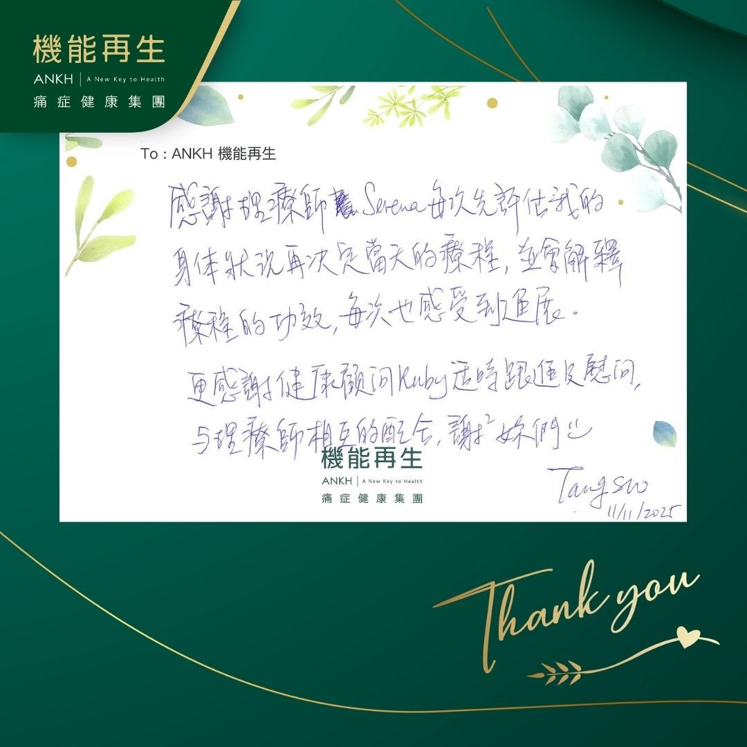 感謝理療師每次先評估我的身體狀況再決定當天的療程,並會解釋療程的功效,每次也感受到進展。 更感謝健康顧問適時跟進及慰問,與理療師相互的配合,謝謝妳們。
