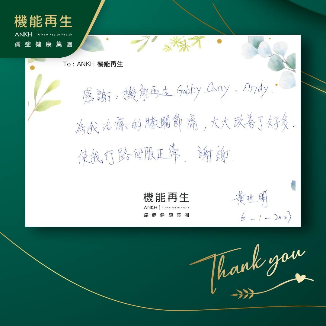 感謝:機能再生為我解決膝關節痛,大大改善了好多,使我行路回復正常,謝謝