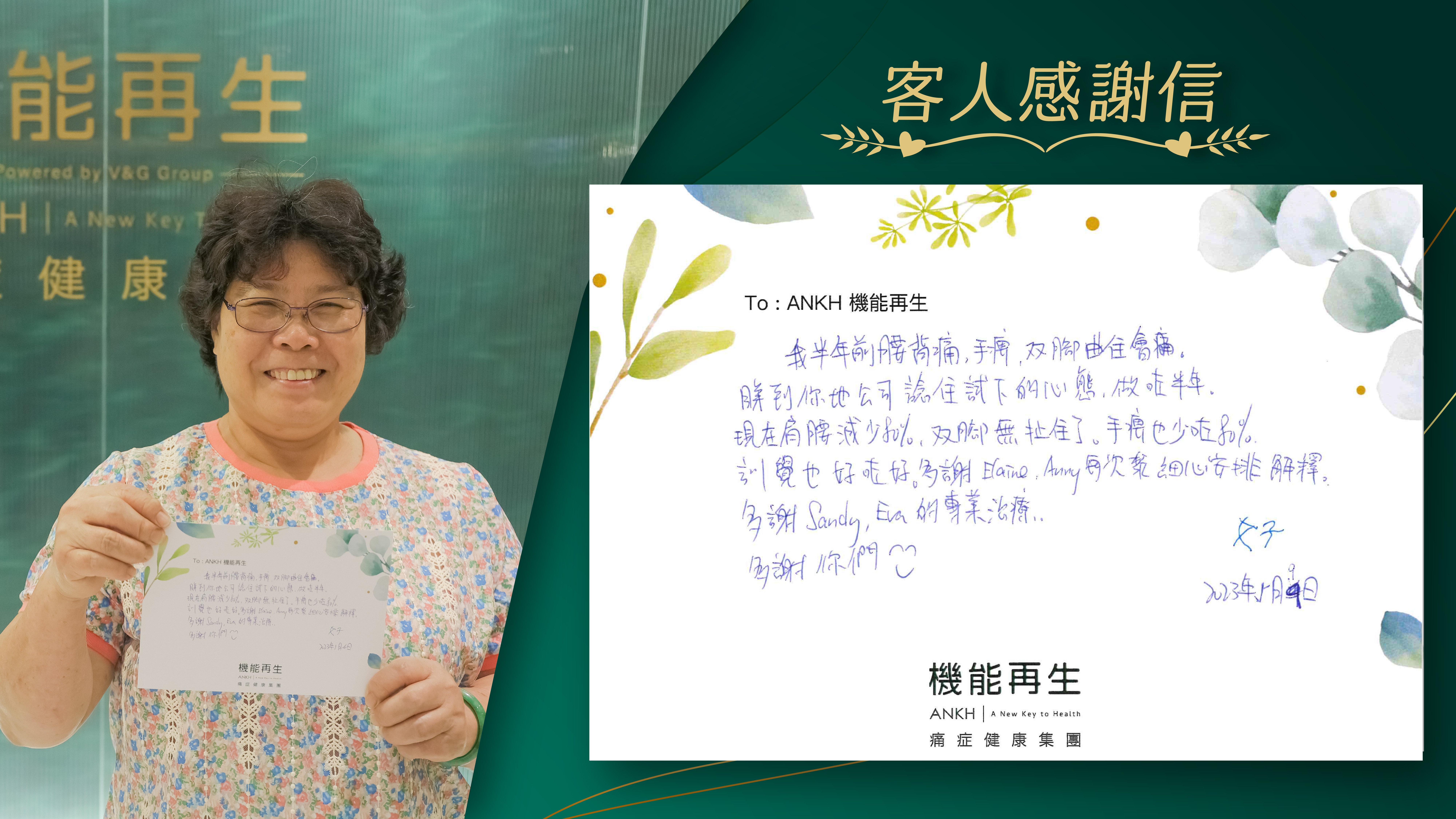 我半年前腰背痛、手痹、雙腳曲住會痛, 睇到你地公司諗住試下的心態,做咗半年。 現在肩腰痛減少80%,雙腳無扯住了。手痹也少咗80% 訓覺也好咗。好多謝專業團隊每次細心安排解釋。 多謝理療師的專業理療. 多謝你們~