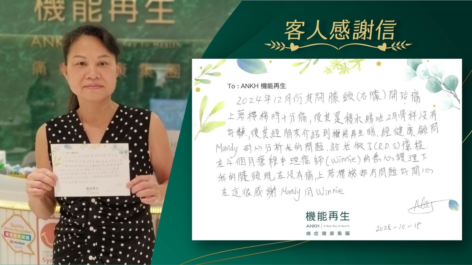 2024年12月份期間,膝頭(右膝)開始痛,上落樓梯時十分痛,後期還有積水,睇咗2月骨科沒有好轉,後期經朋友介紹到機能再生睇,經健康顧問耐心分析我的問題,給我做了RDS+療程,在4個月療程中理療師的悉心護理下,我的膝頭現在沒有痛,上落樓梯都冇問題,好開心,在這很感謝健康顧問及理療師。