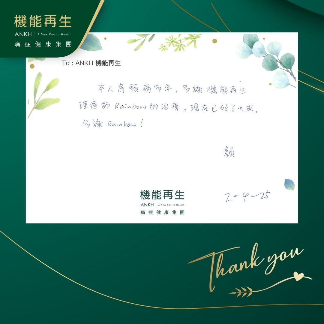 本人肩頸痛多年,多謝機能再生理療師的理療。現在已好了九成,多謝。