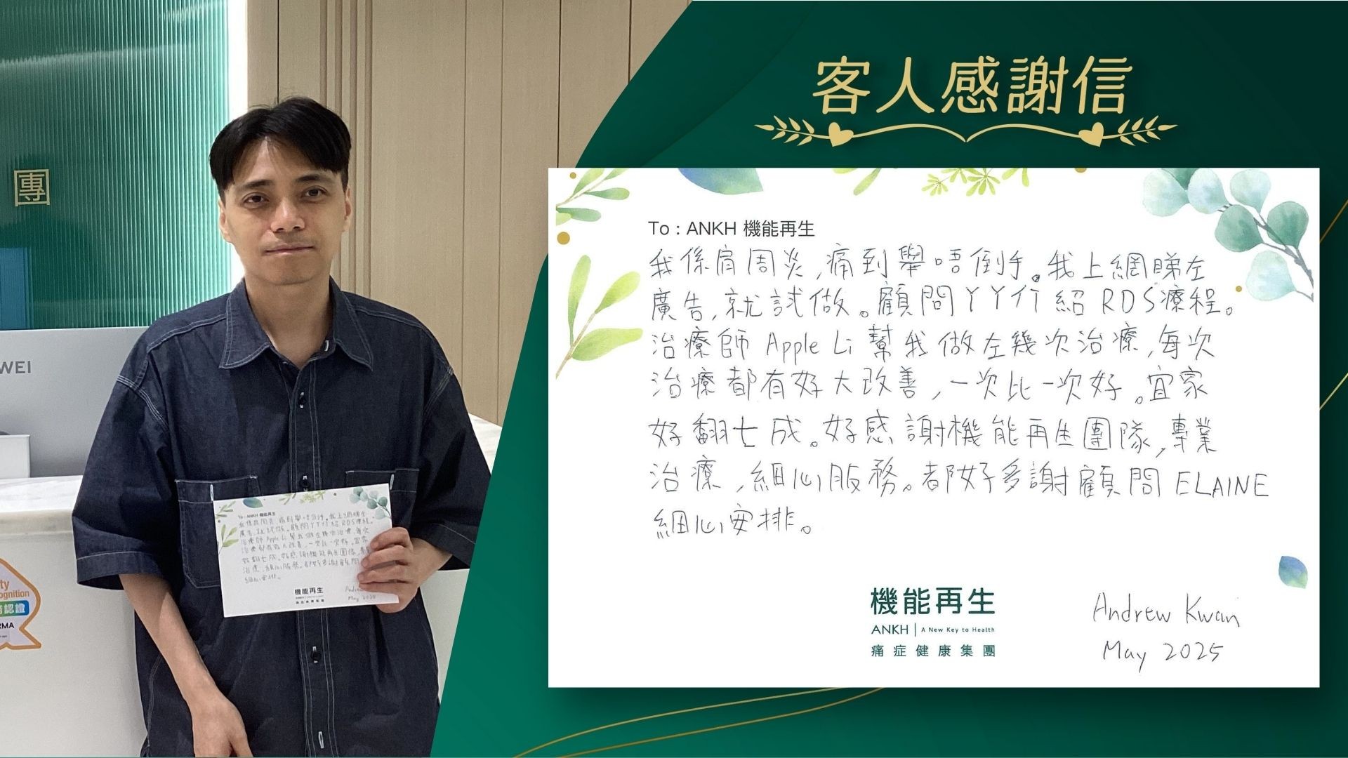 我係肩周炎,痛到舉唔到手,我上網睇咗廣告就開始做。健康顧問介紹RDS+療程,理療師幫我做咗幾次理療,每次理療都有好大改善,一次比一次好。而家好番七成,好感謝機能再生團隊,專業理療,細心服務,都好多謝健康顧問細心安排。