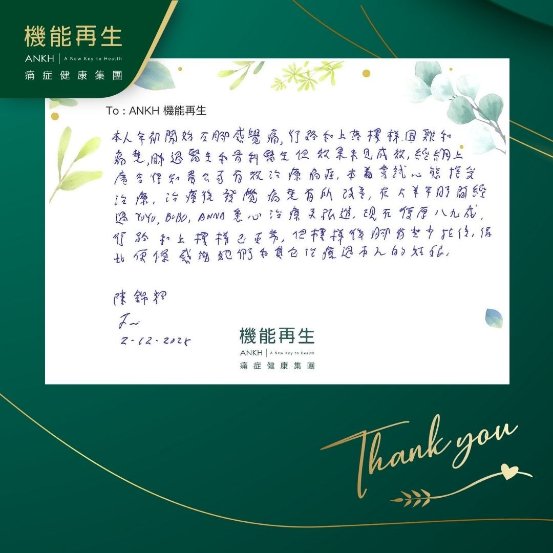本人年初開始左腳感覺痛,行路和上落樓梯困難和痛楚,睇過醫生和骨科醫生但效果未見成效,得知貴公司有效理療痛症,本着嘗試心態接受理療,理療後發覺痛楚有所改善,在大半年時間經過健康顧問、理療師悉心理療及跟進,現在復原八、九成,行路和上樓梯已正常,感謝她們和其他理療過我本人的姑娘。