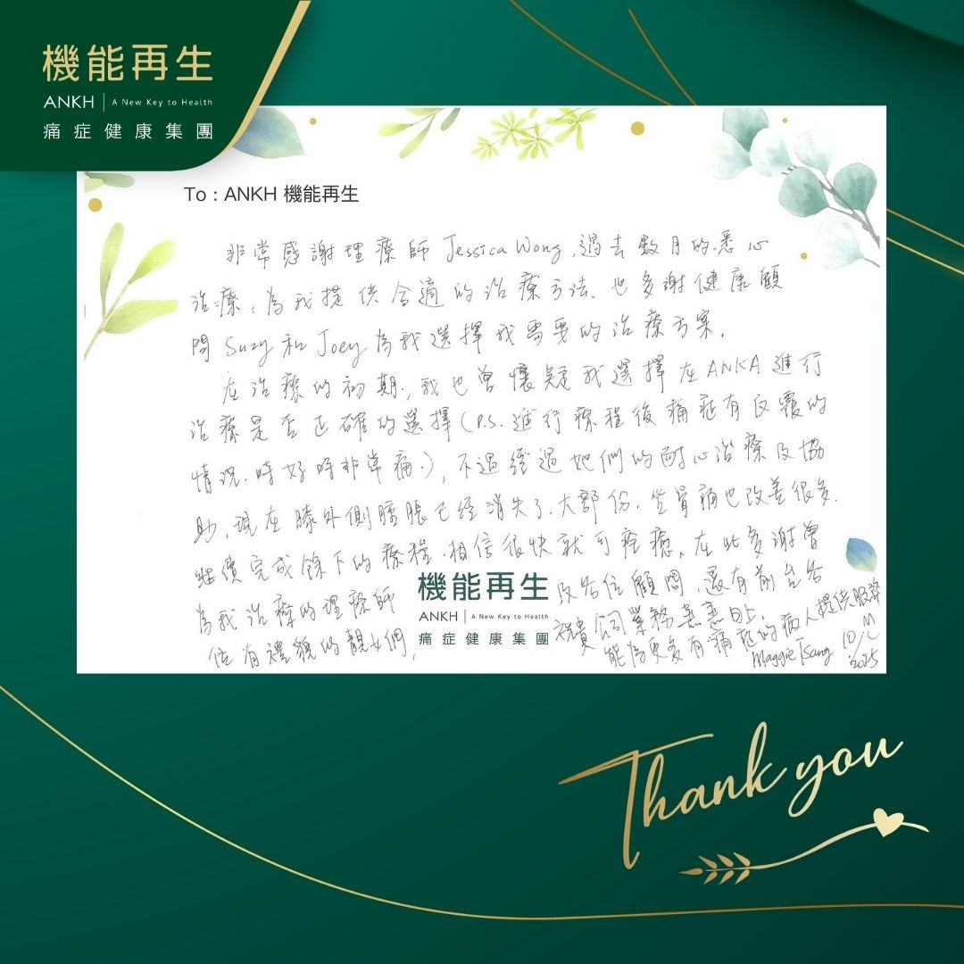 非常感謝理療師,過去數月的悉心理療,為我提供合適的理療方法,也多謝健康顧問為我選擇我需要的理療方案。 在理療的初期,我也曾懷疑我選擇在ANKH進行理療是否正確的選擇,不過經過她們的耐心理療及協助,現在膝外側腫脹已經消失了,大部分坐骨痛也改善很多,繼續完成餘下的療程,相信很快就可痊癒,在此多謝曾為改善痛症的理療師及各位健康顧問,還有前台各位有禮貌的靚女們,祝貴公司業務蒸蒸日上,能為更多有痛症的病人提供服務。