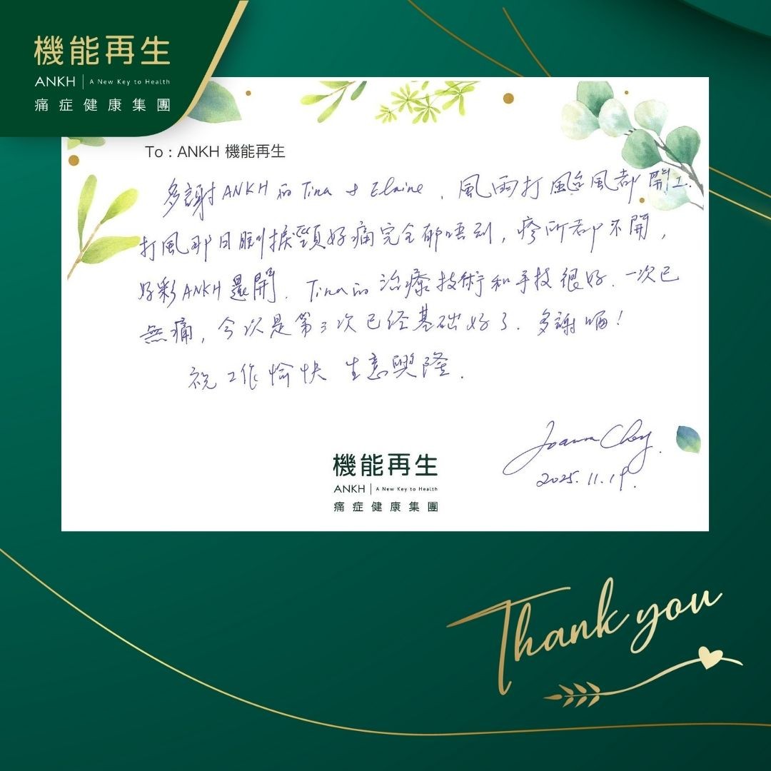 多謝ANKH健康顧問和理療師,風雨打颱風都開工,打風那日瞓捩頸好痛完全郁唔到,診所都不開,好彩ANKH還開,理療師的理療技術和手勢很好,現在已經無痛了,多謝哂! 祝工作愉快、生意興隆!