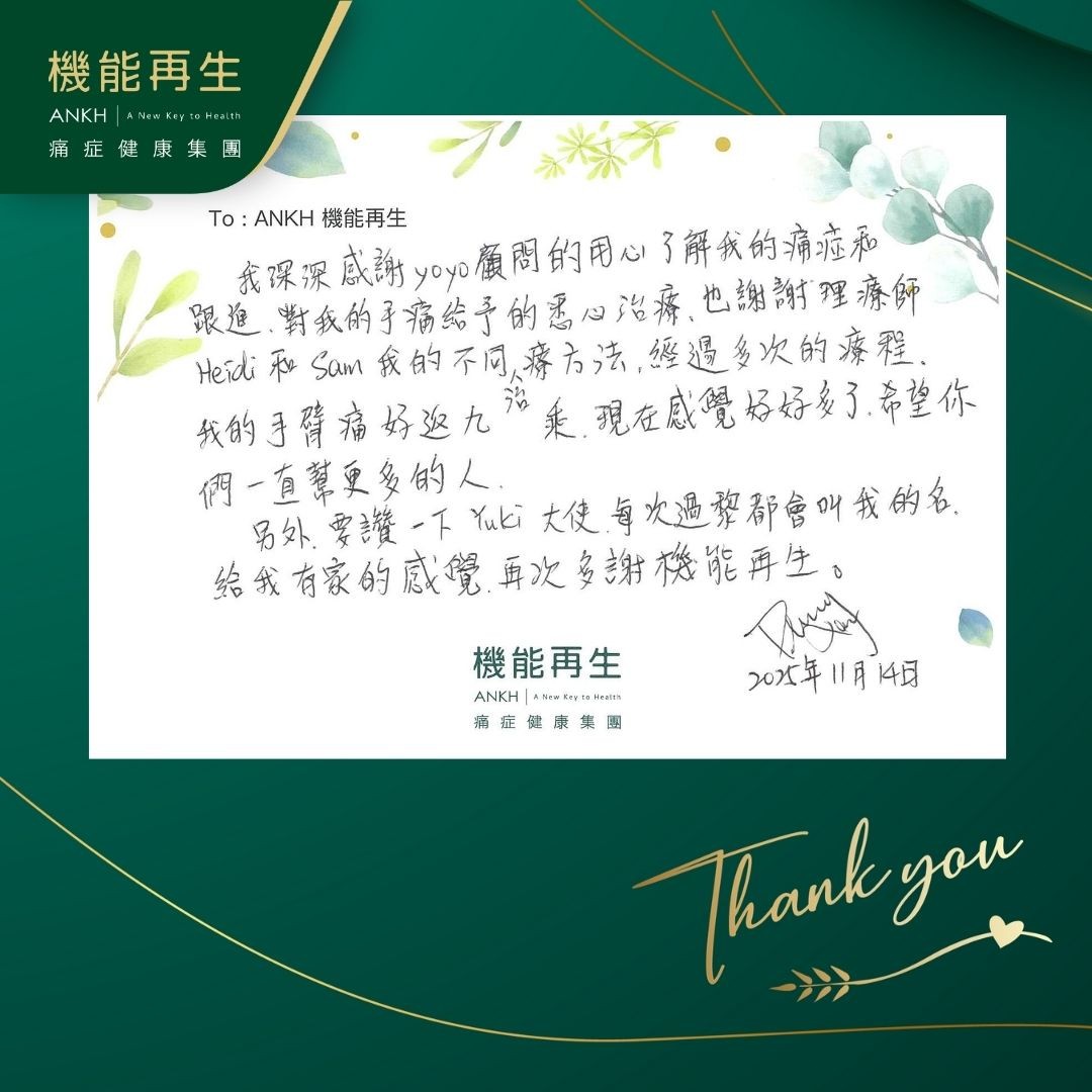 我深深感謝健康顧問的用心了解我的痛症和跟進,對我的手痛給予的悉心理療,也謝謝理療師幫我採用不同的理療方法。經過多次的療程,我的手臂痛好返9成,現在感覺好好多了,希望你們一直幫更多的人。 另外,要讚一下大使,每次過嚟都會叫我的名,給我有家的感覺,再次多謝機能再生。