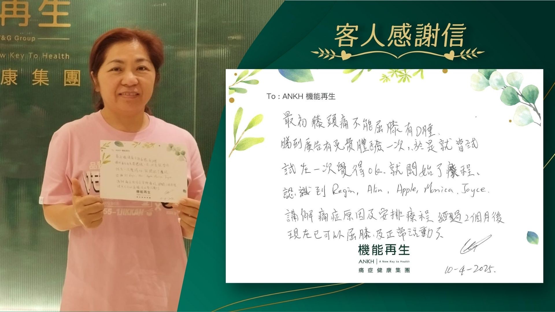 最初膝頭痛不能屈膝有啲腫,試咗一次覺得OK,就開始了療程,認識到健康顧問、理療師,講解痛症原因及安排療程,經過2個月後,現在已可以屈膝及正常活動了。