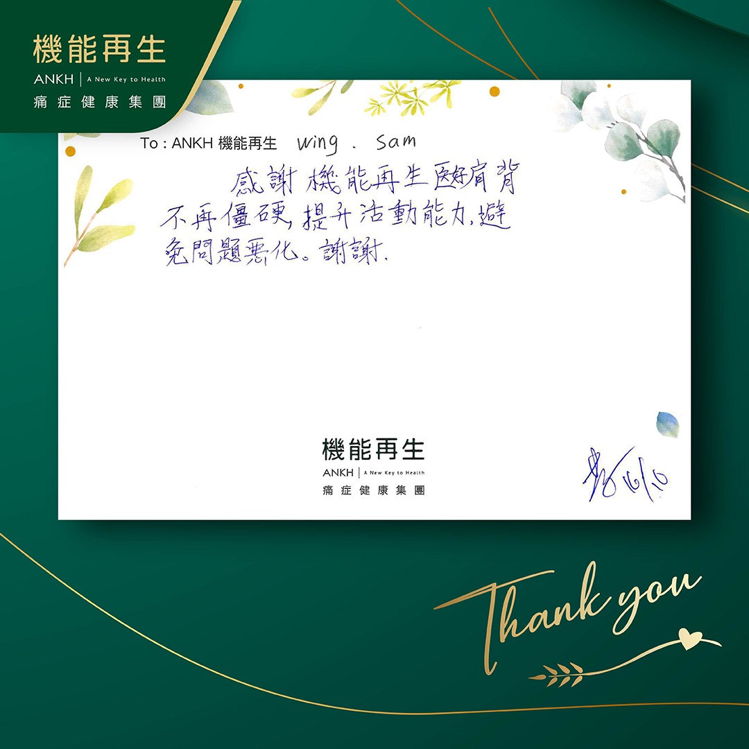 感謝機能再生幫我肩背不再痛及僵硬,提升活動能力,避免問題惡化。謝謝。