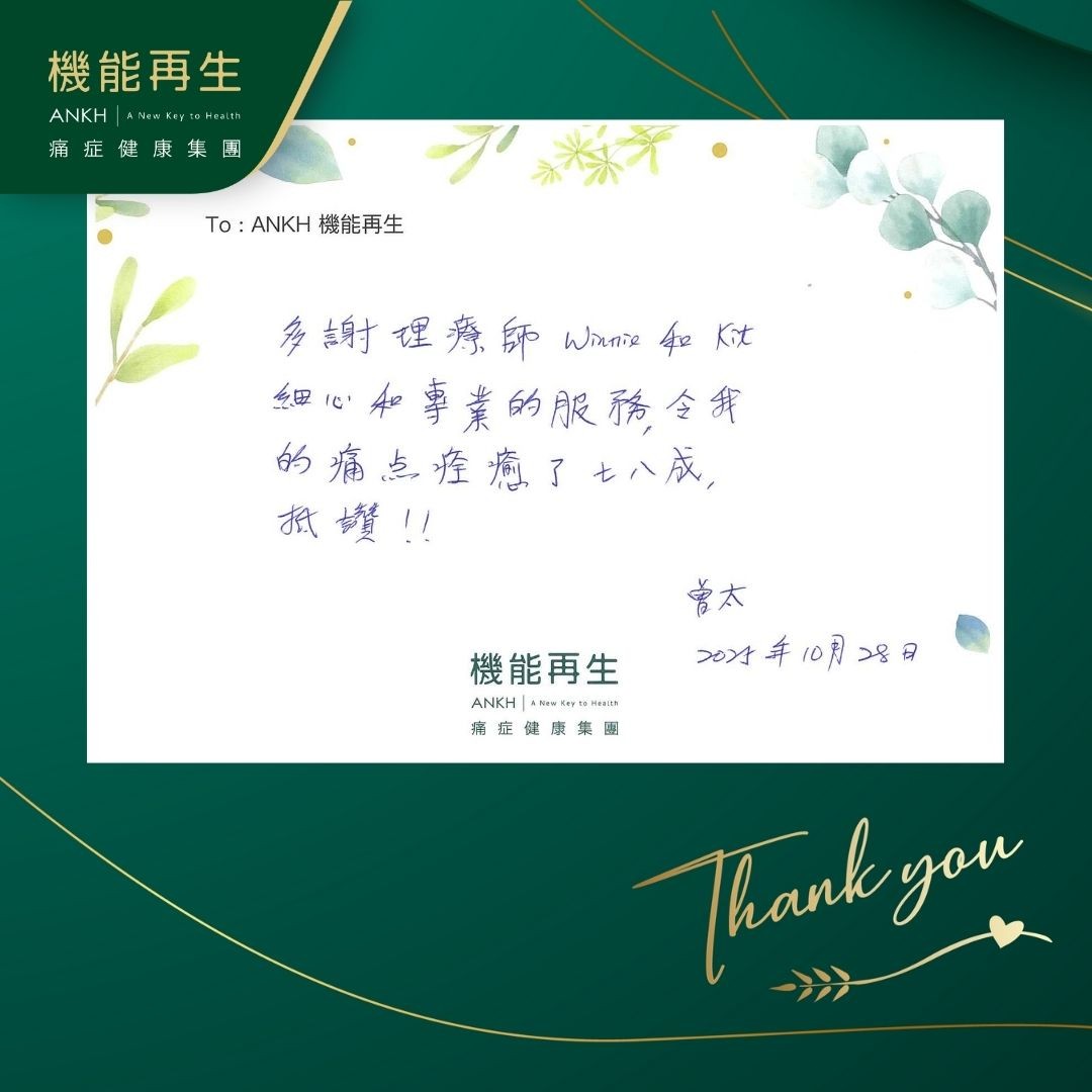 多謝理療師細心和專業的服務,令我的痛點痊癒了七八成,抵讚!