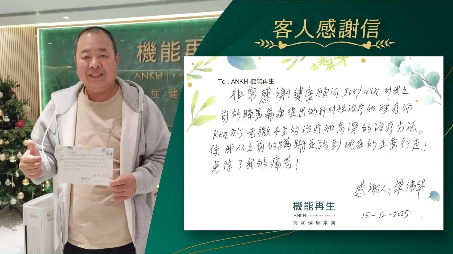 非常感謝健康顧問對我之前的膝蓋痛症提出的針對性理療和理療師無微不至的理療和高深的理療方法。使我從之前的蹣跚走路到現在的正常行走,免除了我的痛苦!