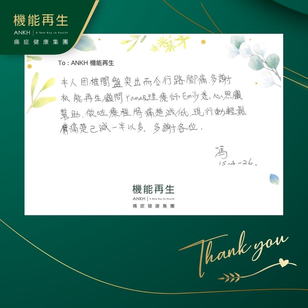 本人因椎間盤突出而令行路腳痛,多謝ANKH機能再生健康顧問及理療師悉心照顧幫助,做咗療程將痛楚減低,現行動輕鬆痛楚已減一半以多。多謝各位。