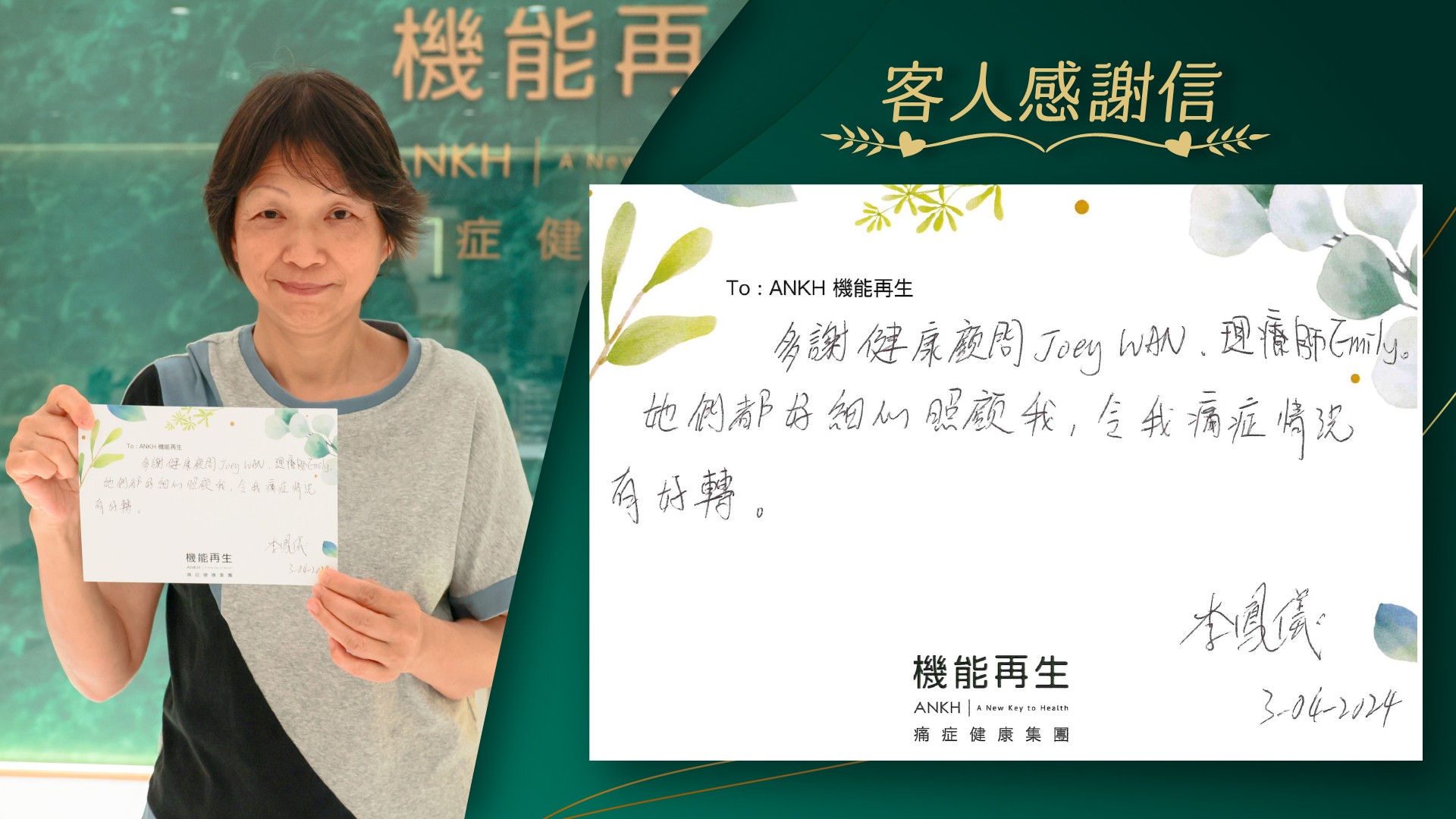 多謝健康顧問、理療師,她們都好細心照顧我,令我痛症情況有好轉。