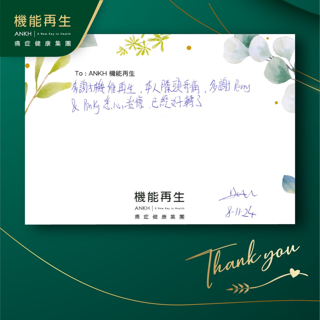 多謝機能再生,本人膝頭哥痛。多謝專業的團隊悉心理療,已經好轉了。