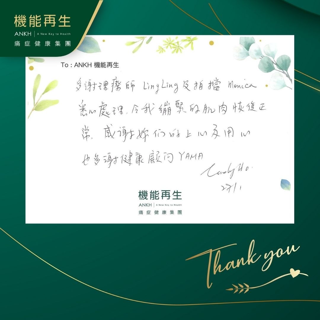 多謝理療師及拍檔悉心處理,令我繃緊的肌肉恢復正常,感謝妳們好上心及用心,也多謝健康顧問。