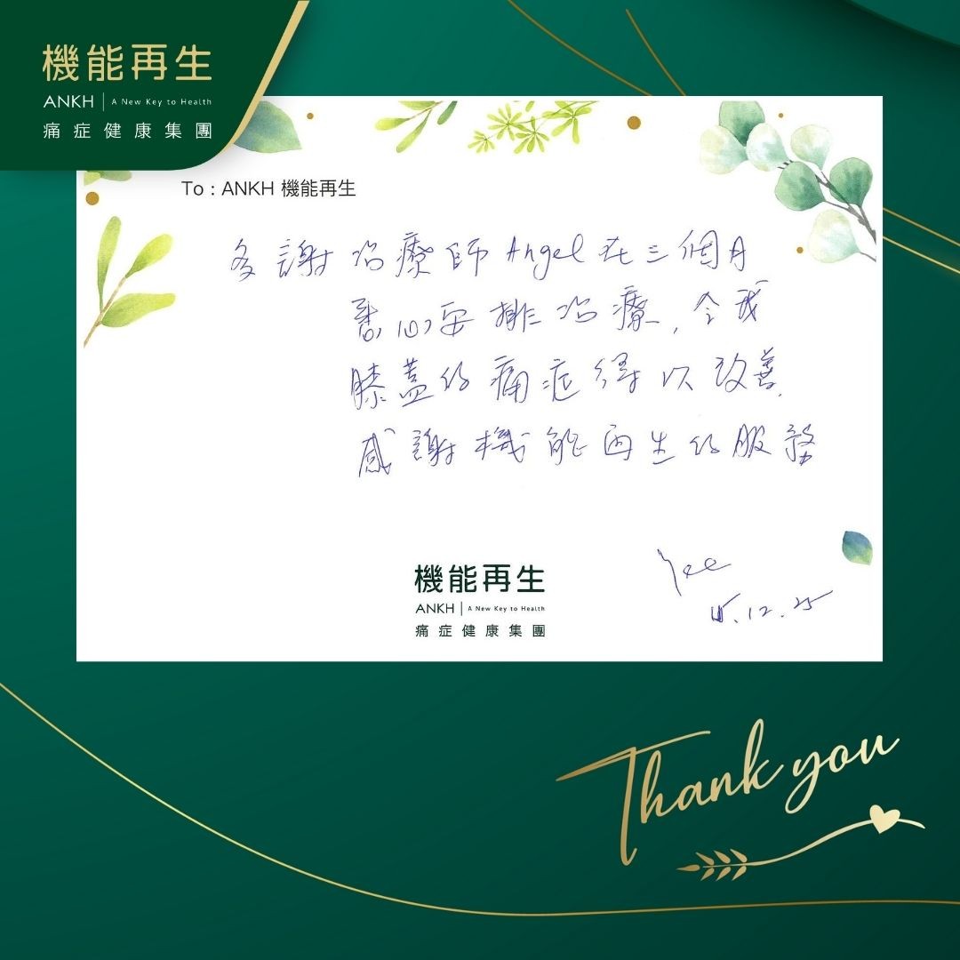 多謝理療師在三個月悉心安排理療,令我膝蓋的痛症得以改善,感謝機能再生的服務。