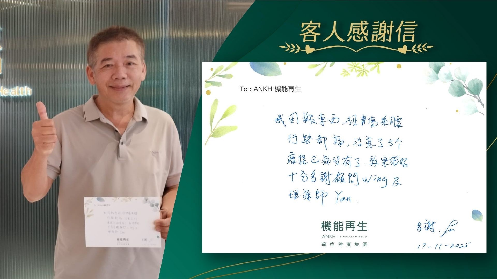 我因搬東西,扭傷條腰行路都痛,完成療程後痛沒有了,效果很好,十分多謝健康顧問及理療師。多謝!