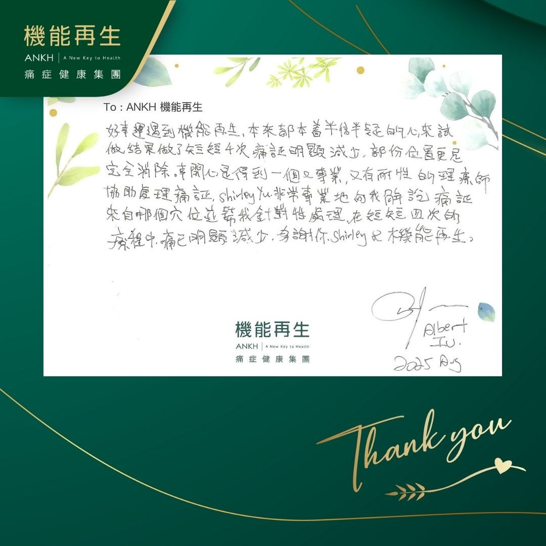 好幸運遇到機能再生,本來都本着半信半疑的心來,結果痛症明顯減少,部分位置更是完全消除。很開心是得到一個又專業,又有耐性的理療師,協助處理痛症。 健康顧問非常專業地向我解說痛症來自哪個穴位並幫我針對性處理,完成療程後,痛已明顯減少,多謝健康顧問及機能再生。