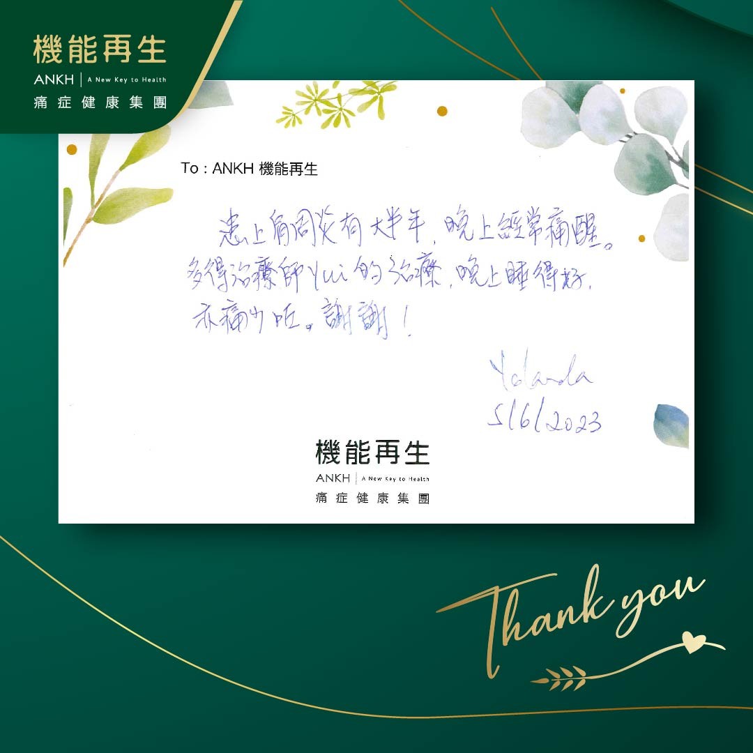 有肩周痛大半年,晚上經常痛醒。多得理療師的療程,晚上睡得好,亦痛少咗。謝謝