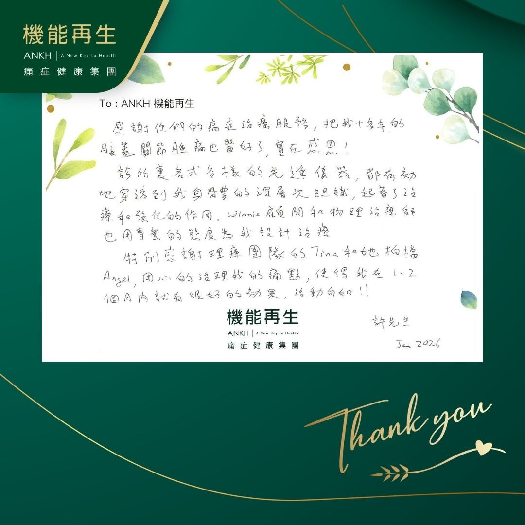 感謝你們的痛症理療服務,把我十多年的膝蓋關節腫痛也好轉了,實在感恩! 御痛中心裡各式各樣的先進儀器,都有效地穿透到我身體的深層次組織,起著了理療和強化的作用。健康顧問和機能強化顧問也用專業的態度為我設計理療。 特別感謝理療團隊的同事們,用心的理療我的痛點,使得我在1、2個月內就有很好的效果,活動自如!