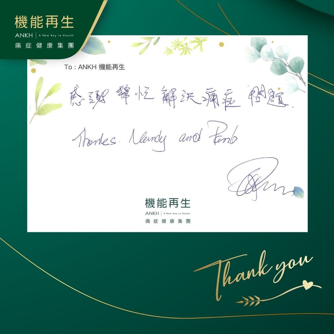 感謝幫忙解決痛症問題,thanks健康顧問和理療師。