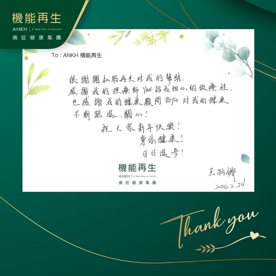 很謝謝機能再生對我的幫助,感謝我們的理療師給我細心的做療程,也感謝我的健康顧問對我的健康不斷跟進、關心! 祝大家新年快樂!身體健康!日日進步!