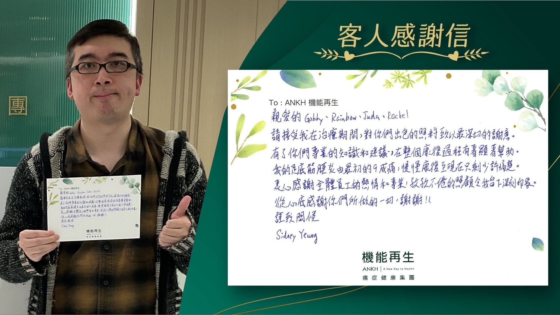 親愛的健康顧問、理療師, 請接受我在理療期間,對你們出色的照料致以最深切的謝意。有了你們專業的知識和建議,在整個過程有著顯著幫助。我的足底筋膜炎由最初的9成痛,慢慢好轉至現在只剩少許痛楚。 衷心感謝全體員工的熱情和專業,孜孜不倦的照顧令我留下深刻印象。 從心底感謝你們所做的一切,謝謝! 謹致問候