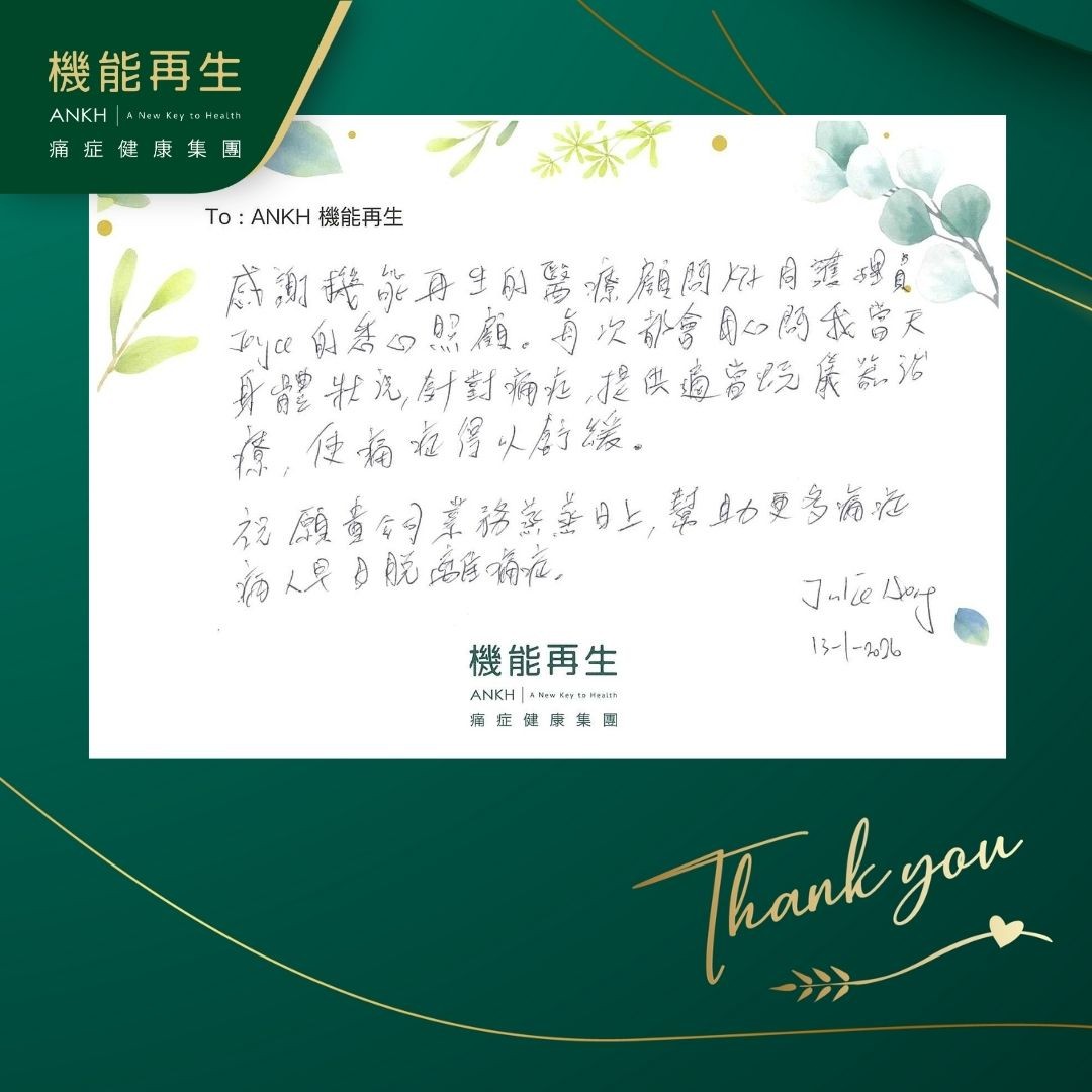 感謝機能再生的健康顧問同理療師的悉心照顧,每次都會用心問我當天身體狀況,針對痛症,提供適當嘅儀器理療,使痛症得以舒緩。 祝願 貴公司業務蒸蒸日上,幫助更多痛症人士早日脫離痛症。