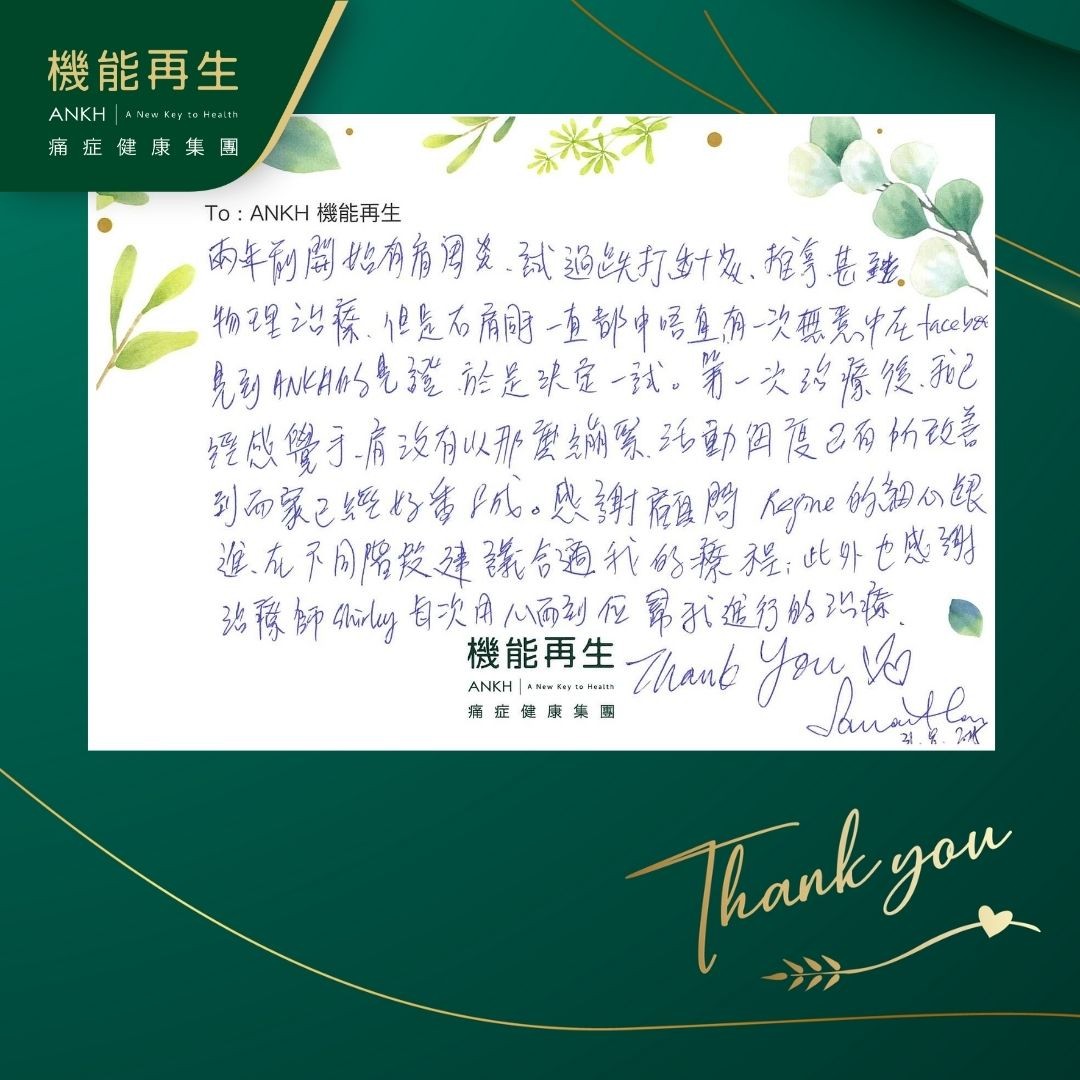 兩年前開始有肩周炎,試過跌打針灸,推拿,甚至物理治療,但是右肩周手一直都伸唔直,有一次無意中在Facebook。見到ANKH的見證,於是決定一試。第一次理療後,我已經感覺手、肩沒有以往那麼繃緊,活動角度已有所改善,到而家已經好番8成。感謝健康顧問的細心跟進,在不同階段建議合適我的療程,此外也感謝理療師每次用心而到位幫我進行的理療。Thank you!