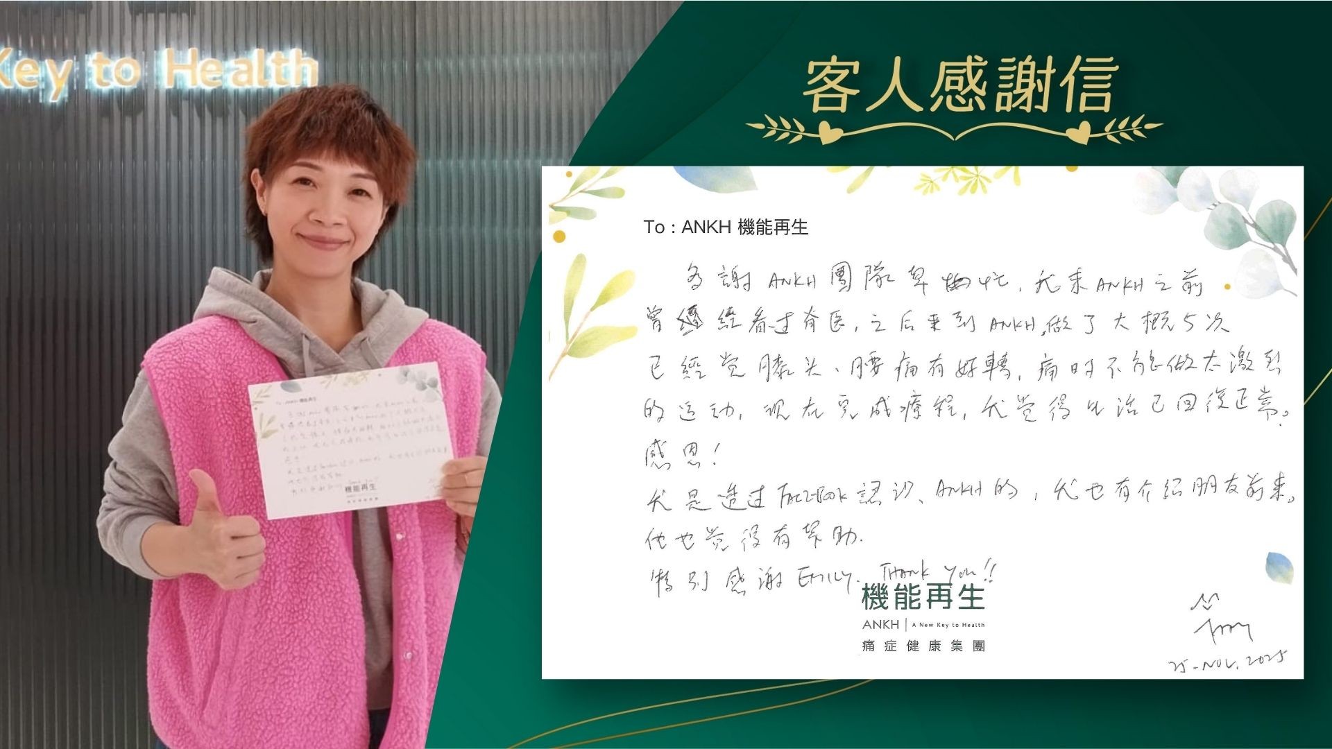 多謝ANKH團隊,我來ANKH之前曾經看過脊醫,之後來到ANKH,做了療程,已經覺得膝頭、腰痛有好轉,痛時不能做太激烈的運動,現在完成療程,我覺得生活已回復正常,感恩! 我是透過Facebook認識ANKH的,我也有介紹朋友前來,他也覺得有幫助。 特別感謝理療師。Thank you!